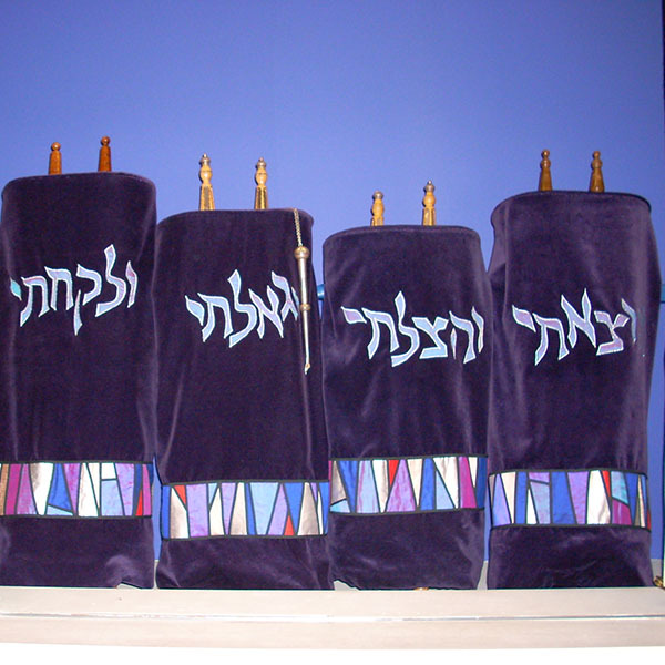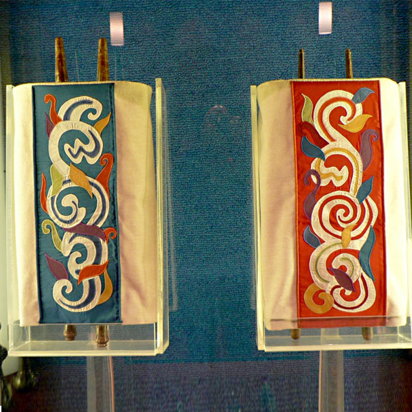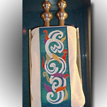 Each synagogue, temple, and beit midrash has its own special ambiance. Judy's elegant Torah covers reflect this, and are designed to fit into the overall style of the sanctuaries and arks in which the Torahs are housed.